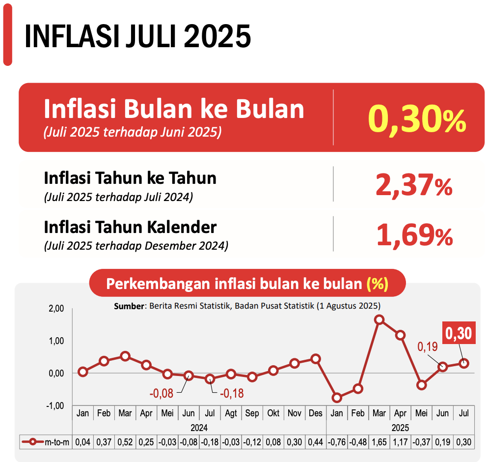 Badan Pusat Statistik (BPS) mencatat inflasi Juli masih berada di 2,37% secara tahunan (year-on-year/yoy). Sepanjang 2025 (year-to-date/ytd), inflasi berada di 1,69%.