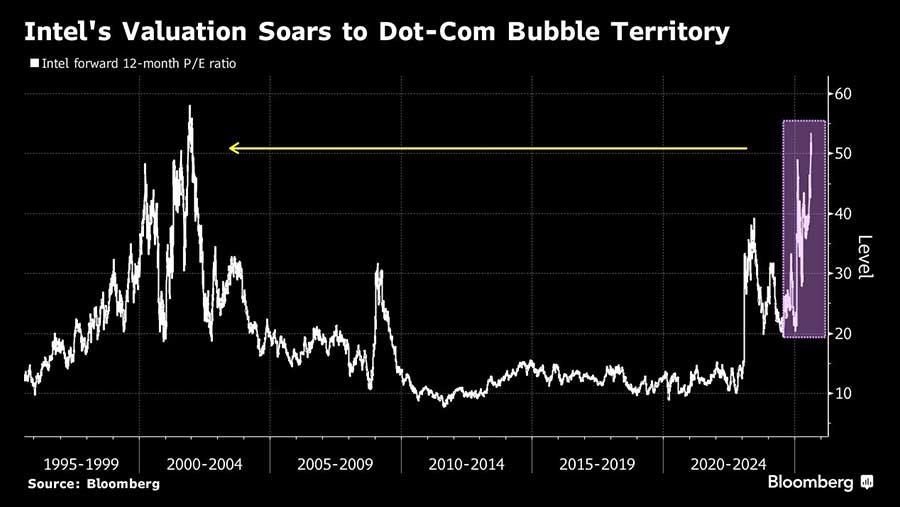 Saham produsen chip, yang sedang kesulitan ini telah melonjak 28% bulan ini, menambah sekitar US$24 miliar nilai pasar, didorong oleh laporan bahwa pemerintah AS sedang dalam pembicaraan untuk kepemilikan saham, serta rencana investasi US$2 miliar dari SoftBank Group Corp. asal Jepang. Lonjakan ini membuat Intel diperdagangkan pada 53 kali laba yang diproyeksikan untuk 12 bulan ke depan, level tertinggi sejak awal 2002, menurut data yang dikumpulkan oleh Bloomberg.