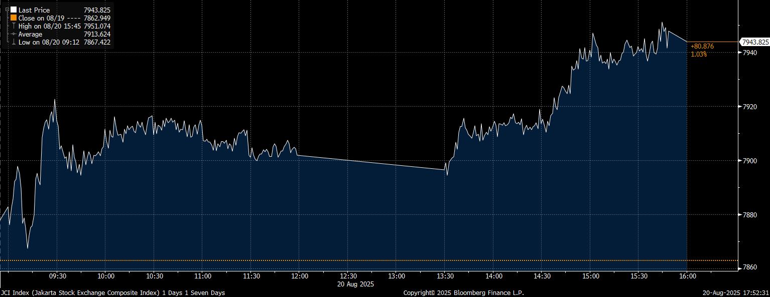 Bloomberg Technoz, Jakarta - IHSG menutup perdagangan di zona hijau dengan menguat 80,87 poin (1,03%) pada posisi 7.943,82 pada Rabu (20/8/2025). IHSG melesat di zona positif terjadi saat Bank Indonesia menurunkan tingkat suku bunga acuan BI Rate menjadi 5%.