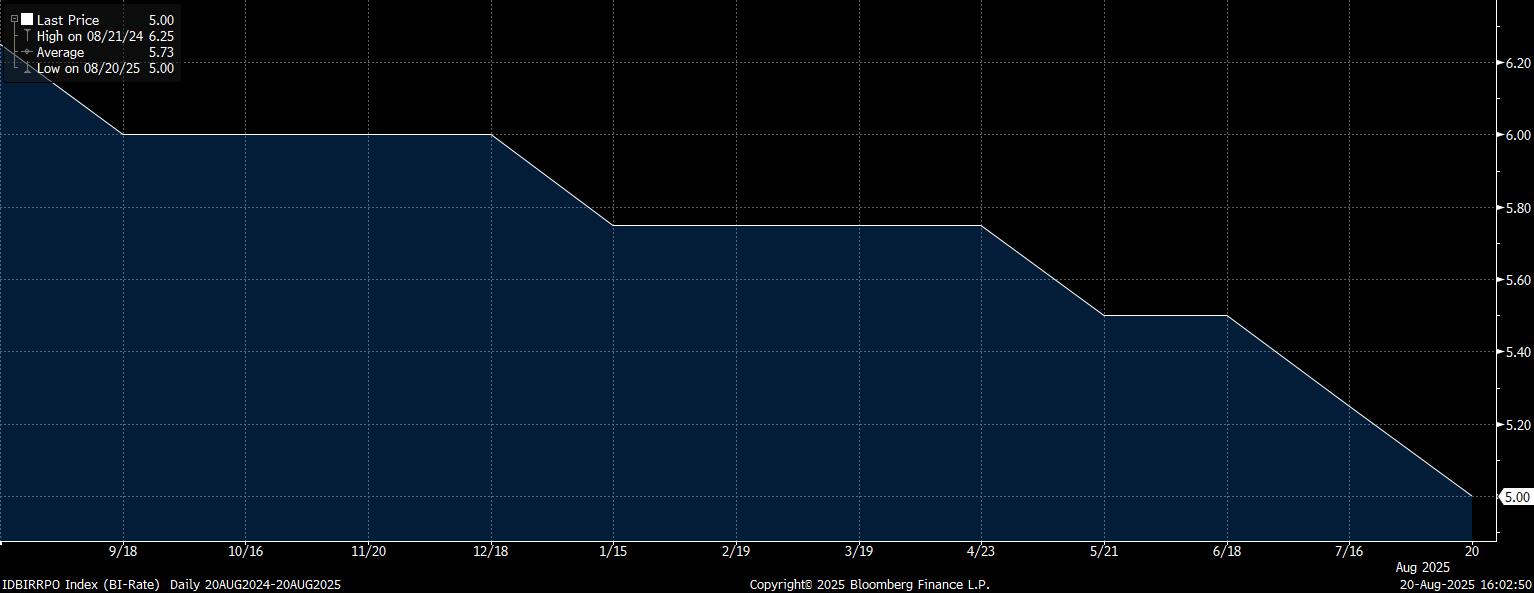 Rapat Dewan Gubernur (RDG) BI pada 19–20 Agustus 2025 memutuskan menurunkan BI Rate sebesar 25 basis poin menjadi 5%, suku bunga Deposit Facility turun menjadi 4,25%, dan suku bunga Lending Facility turun menjadi 5,75%.