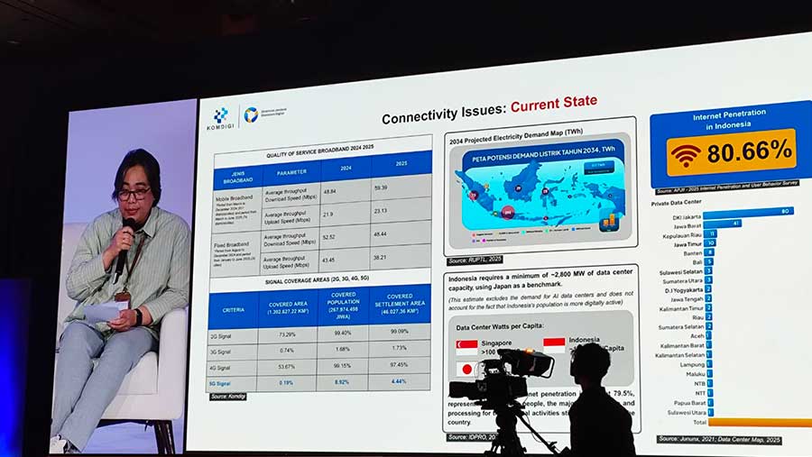 Bloomberg Technoz, Jakarta - Direktur Kecerdasan Artifisial dan Ekosistem Teknologi Baru Direktorat Jenderal Ekosistem Teknologi Baru Kementerian Komunikasi dan Digital, Aju Widya Sari, mengungkapkan bahwa kapasitas pusat data (data center) di Indonesia hanya kurang lebih 1,5 watt per kapita. Dia menilai angka itu masih di bawah Jepang dan Singapura.