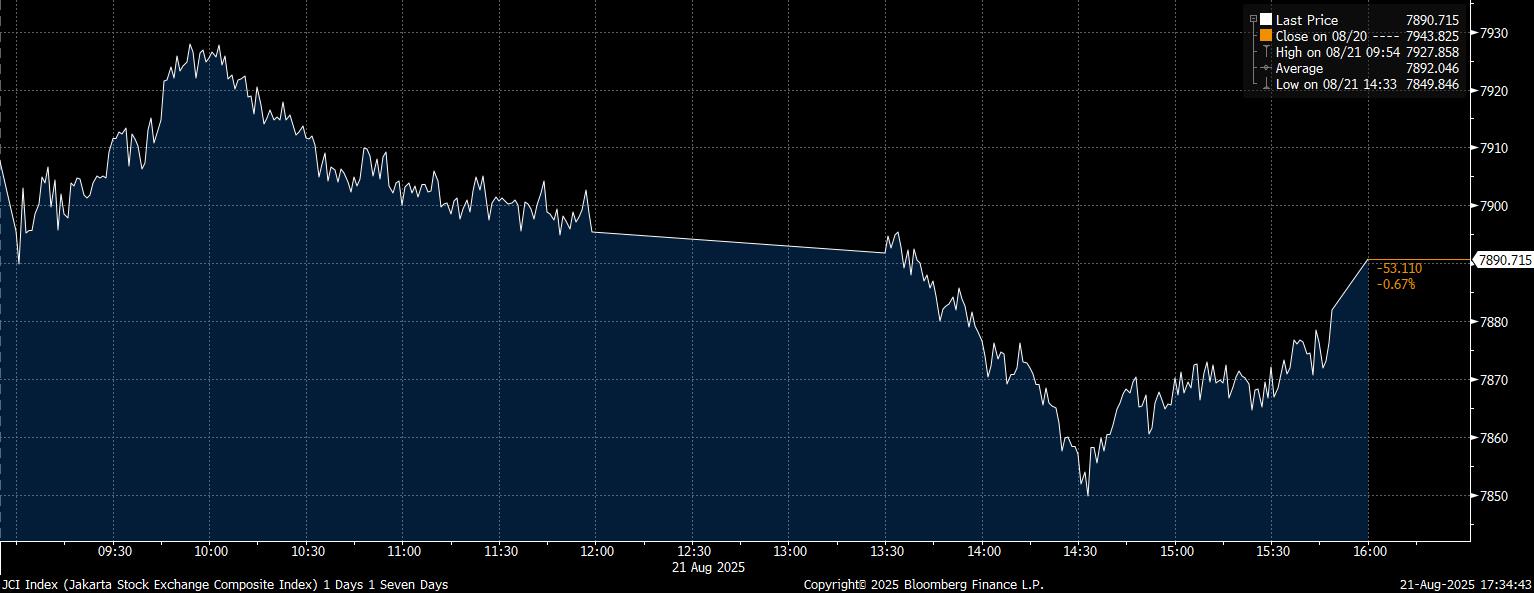 Bloomberg Technoz, Jakarta - Indeks Harga Saham Gabungan (IHSG) menutup perdagangan Sesi II di zona merah. IHSG melemah 53,11 poin atau ambles mencapai 0,67% ke level 7.890,71 pada Kamis (21/8/2025). Saham DSSA, INKP hingga saham ARTO jadi pemberat.