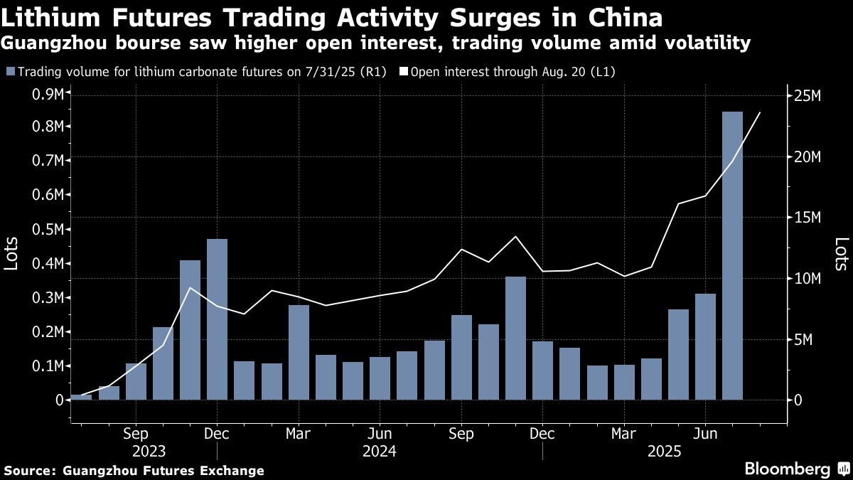 Volume Bursa Berjangka Guangzhou pada Juli tercatat sebagai bulan tersibuk sejak kontrak litium diluncurkan pada 2023, menurut data bursa. Minat terbuka—jumlah taruhan yang beredar pada harga—juga mencapai rekor, dengan lonjakan yang berlanjut hingga bulan ini.