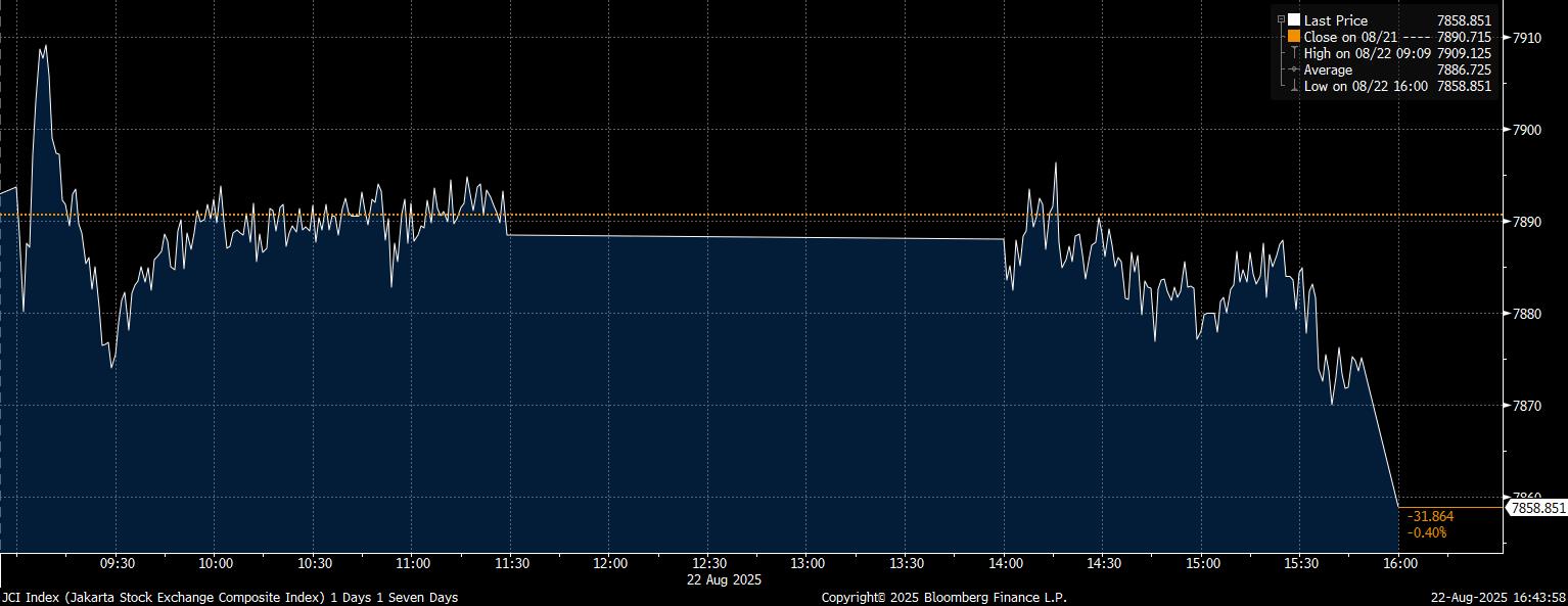 Bloomberg Technoz, Jakarta - IHSG pada penutupan perdagangan Jumat (22/8/2025), melemah bertambah dalam hingga terjerembab 31,86 poin (0,4%) ke posisi 7.858,85 di tengah sikap antisipasi Pidato Powell di Jackson Hole, mencermati sinyal The Fed ke depan.