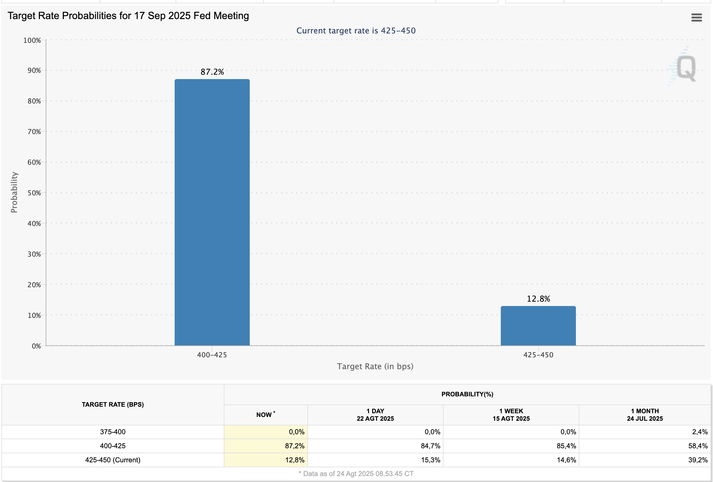Sepertinya pernyataan Powell tersebut membuat pasar kembali yakin bahwa The Fed bakal memangkas suku bunga acuan dalam rapat bulan depan. Mengutip CME FedWatch, probabilitas penurunan Federal Funds Rate sebesar 25 basis poin (bps) ke 4-4,25% dalam rapat September kini berada di 87,2%. Naik ketimbang peluang seminggu yang lalu yakni 85,4%.