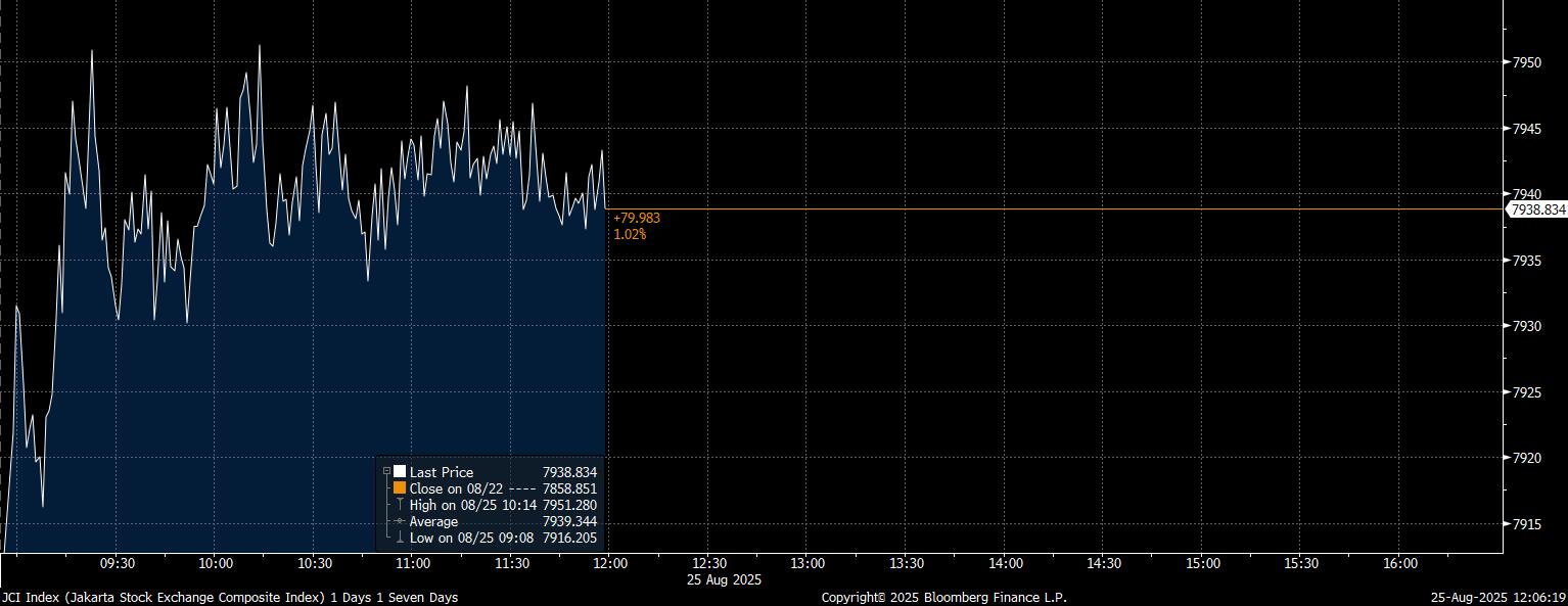 Bloomberg Technoz, Jakarta - Indeks Harga Saham Gabungan (IHSG) berhasil menutup perdagangan Sesi I, Senin (25/8/2025), di zona hijau dengan kenaikan 79,98 poin (1,02%) ke 7.938,83.