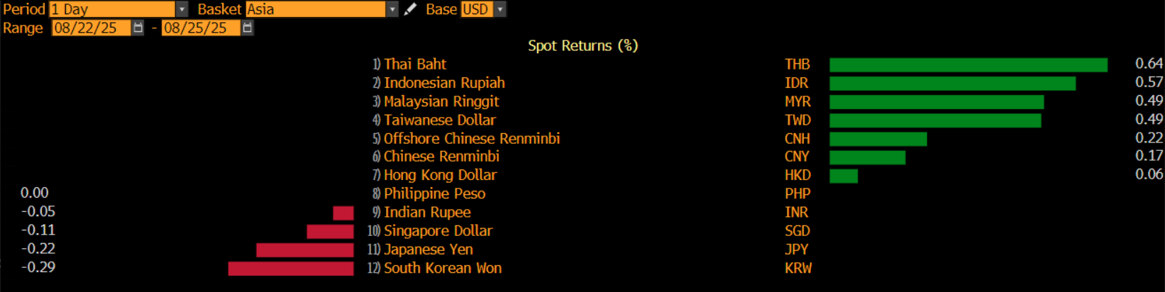 Di Asia, berdasarkan data Bloomberg, baht Thailand berhasil memimpin penguatan dengan 0,64%, ringgit Malaysia terapresiasi 0,49%, lalu menyusul dolar Taiwan 0,49%, yuan dengan positif 0,22%, dan dolar Hong Kong dengan penguatan 0,06%.