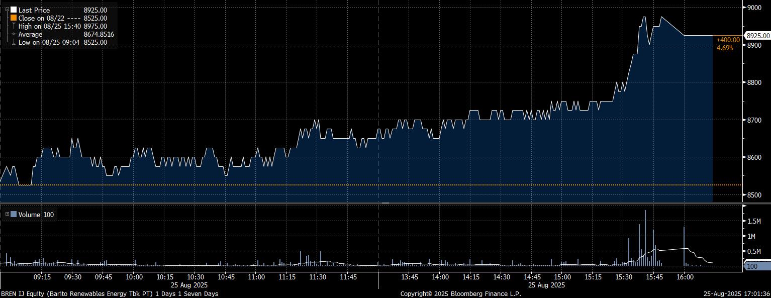 Yang lebih potensial, saham BREN mencatatkan kenaikan 400 poin dengan menguat 4,69% ke posisi Rp8.925/saham. Nilai transaksi jual–beli saham BREN mencapai 27 juta saham dengan nilai Rp242 miliar.