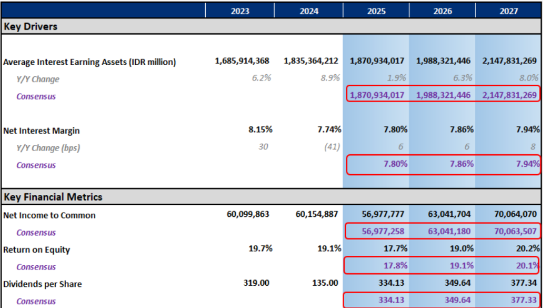 “Dengan asumsi pertumbuhan kredit satu digit tinggi, pertumbuhan laba dinilai akan turun 5% pada 2025, sebelum berbalik naik masing–masing 10% pada 2026 dan 2027, menurut perhitungan Bloomberg Interactive Calculator.”