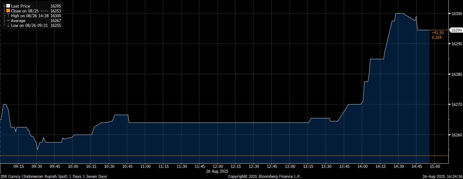 Pada Selasa (26/8/2025), US$ 1 dihargai Rp 16.295 di penutupan erdagangan pasar spot. Mata uang Tanah Air terdepresiasi 0,26% dibanding posisi penutupan perdagangan hari sebelumnya, berdasarkan data Bloomberg.