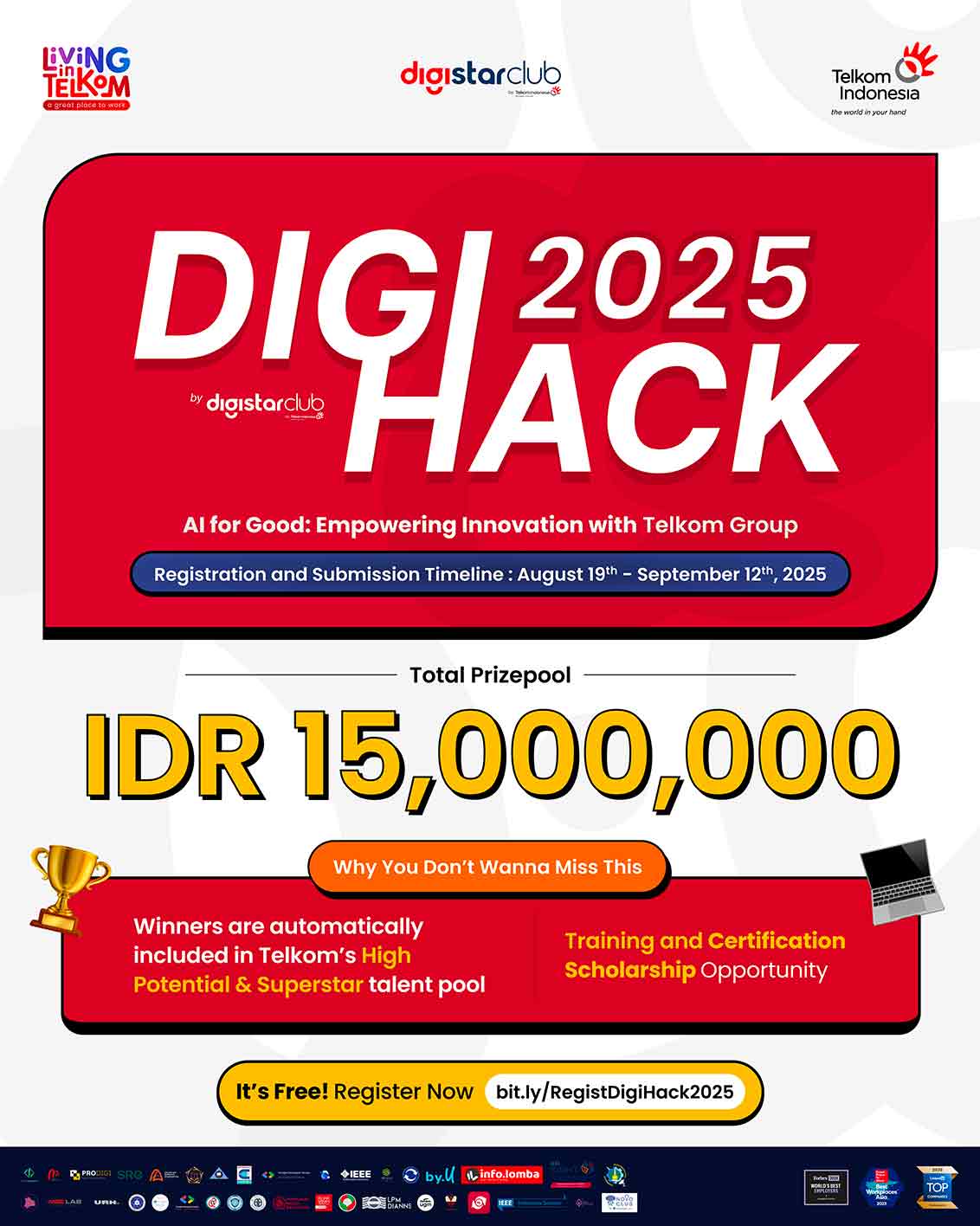 Pendaftaran DigiHack 2025 dibuka mulai 19 Agustus hingga 12 September 2025 melalui bit.ly/RegistDigiHack2025.