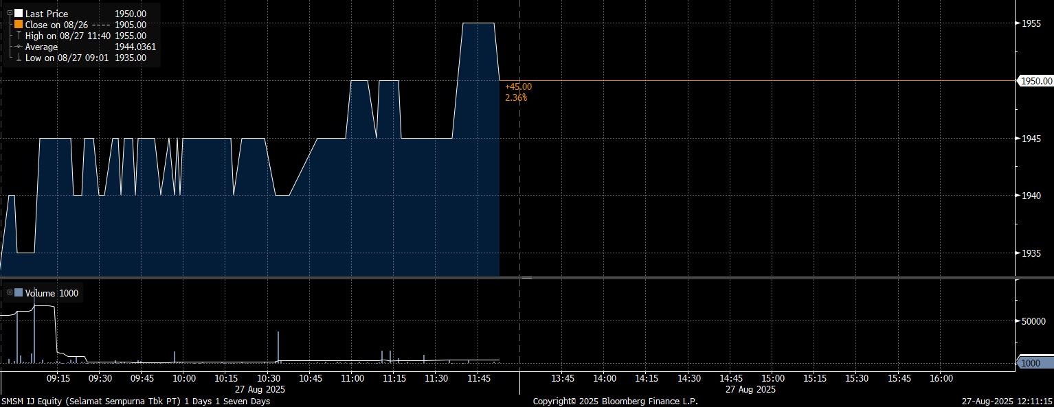 Emiten saham PT Selamat Sempurna Tbk (SMSM) yang bergerak pada bidang pembuatan spare parts otomotif dan mesin dan produk di dalam negeri dengan penunjang lainnya juga berhasil menguat mencapai 2,36% ke harga Rp1.950/saham.