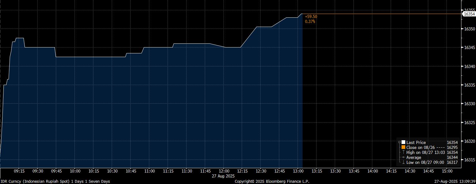 Pada Rabu (27/8/2025) pukul 13:10 WIB, US$ 1 seharga dengan Rp 16.354 di perdagangan pasar spot. Mata uang Nusantara terdepresiasi 0,37% dibanding penutupan perdagangan hari sebelumnya.