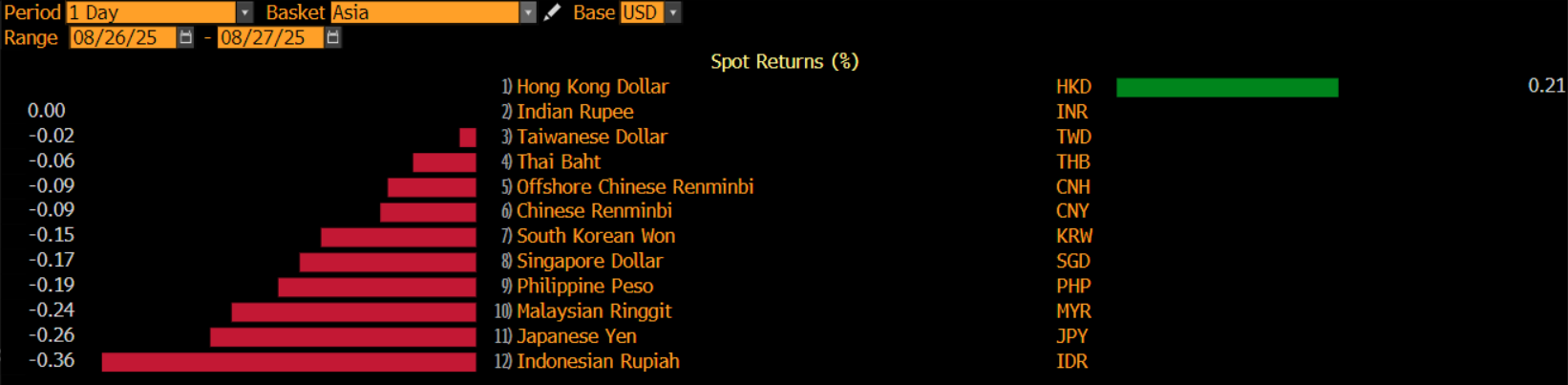 Berbagai mata uang utama Asia juga terdampar di zona pelemahan. Namun memang, rupiah sang mata uang Indonesia terpaksa menjadi yang terlemah di Asia. Disusul oleh yen Jepang dengan depresiasi 0,26%, ringgit Malaysia turut melemah 0,24%, dan peso Filipina 0,19%.