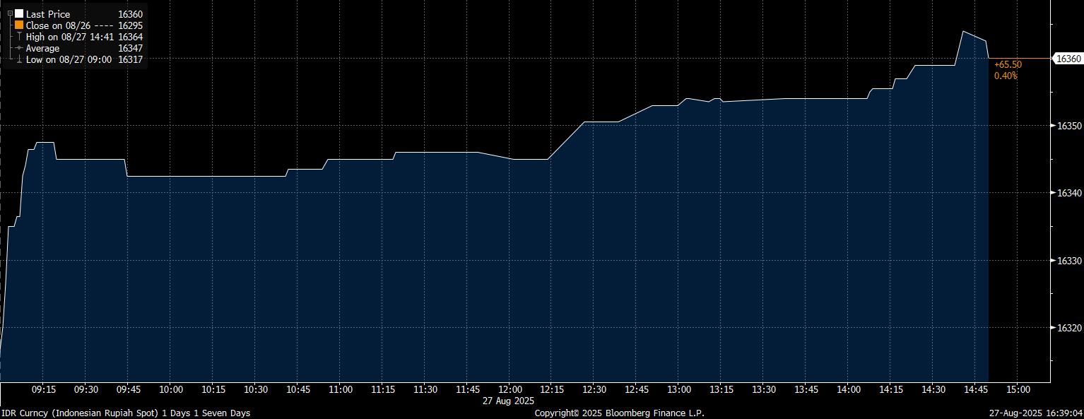 Pada Rabu (27/8/2025) pada tutup perdagangan, US$ 1 dihargai Rp 16.360 di pasar spot, berdasarkan data Bloomberg. Mata uang Tanah Air Indonesia terdepresiasi 0,4% dibanding posisi penutupan perdagangan hari sebelumnya.