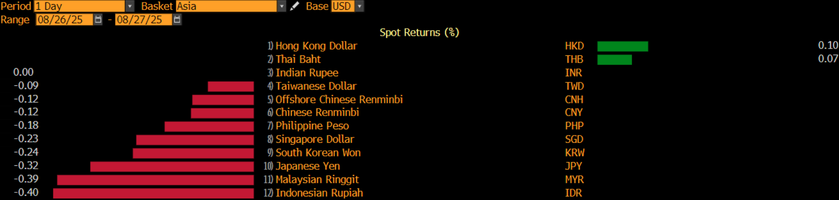 Tidak hanya rupiah, berbagai mata uang utama Asia lainnya pun tidak berdaya di hadapan dolar AS, ringgit Malaysia, yen Jepang, won Korea, dolar Singapura, peso Filipina, yuan China, dan dolar Taiwan juga melemah sepanjang hari ini dengan pelemahan masing–masing mencapai 0,39%, 0,32%, 0,24%, 0,23%, 0,18%, 0,12%, dan 0,09%