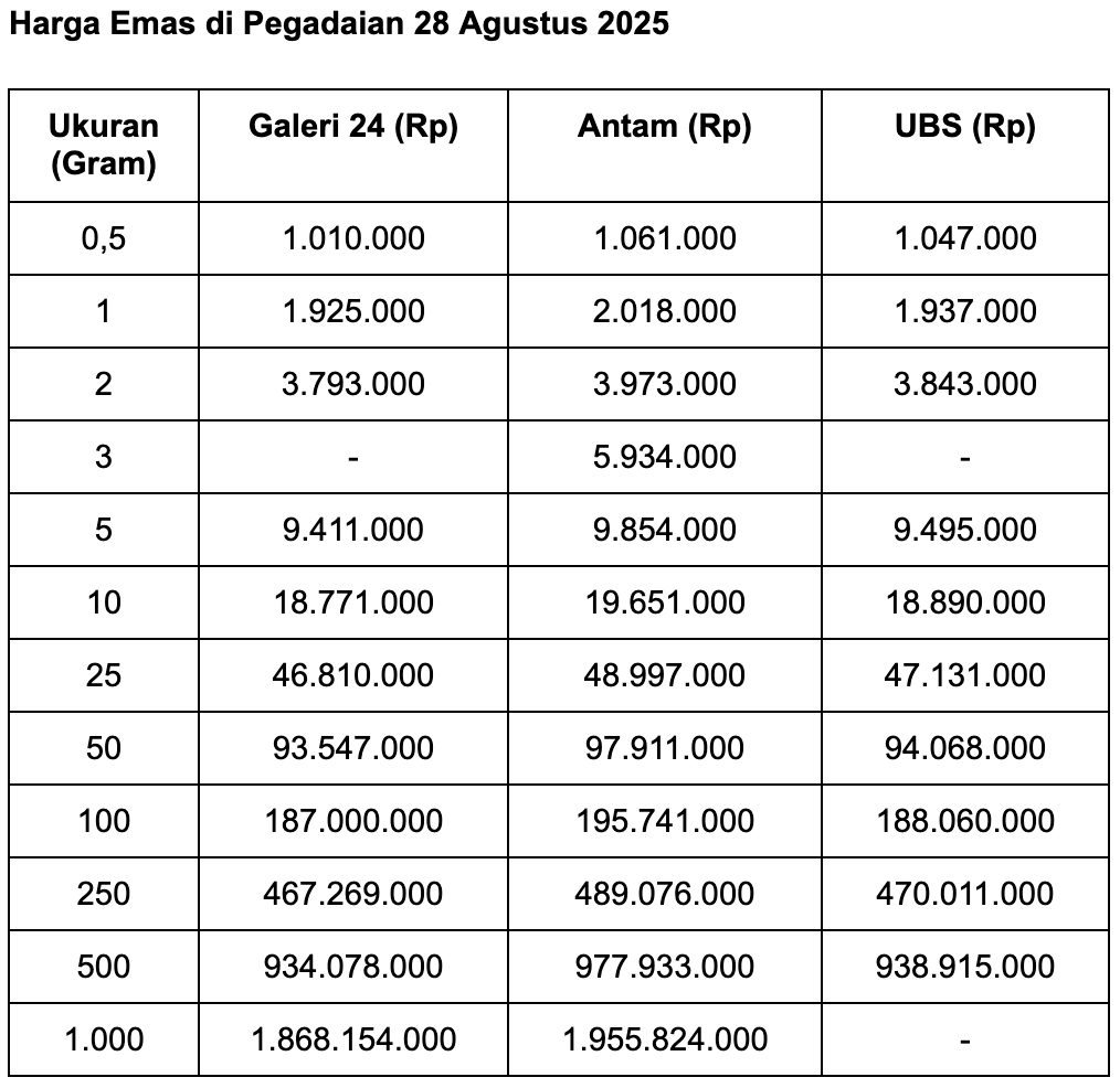 Sedangkan untuk ukuran 1 gram, harga emas Galeri 24 di Pegadaian adalah Rp 1.925.000. Dalam sehari, lompat Rp 8.000