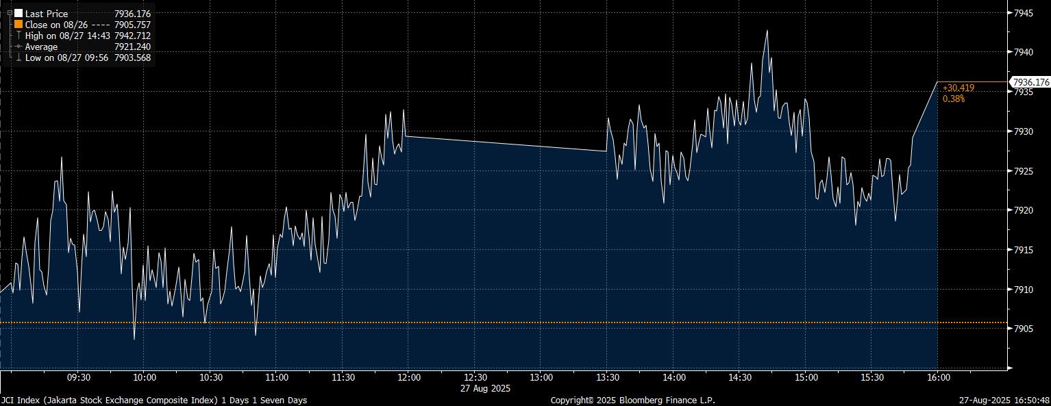 Bloomberg Technoz, Jakarta - Indeks Harga Saham Gabungan (IHSG) pada perdagangan kemarin Rabu (27/8/2025) ditutup di zona hijau. IHSG menguat 0,38% hingga melesat di posisi 7.936,17. Lantas bagaimana dengan rekomendasi saham hari ini?