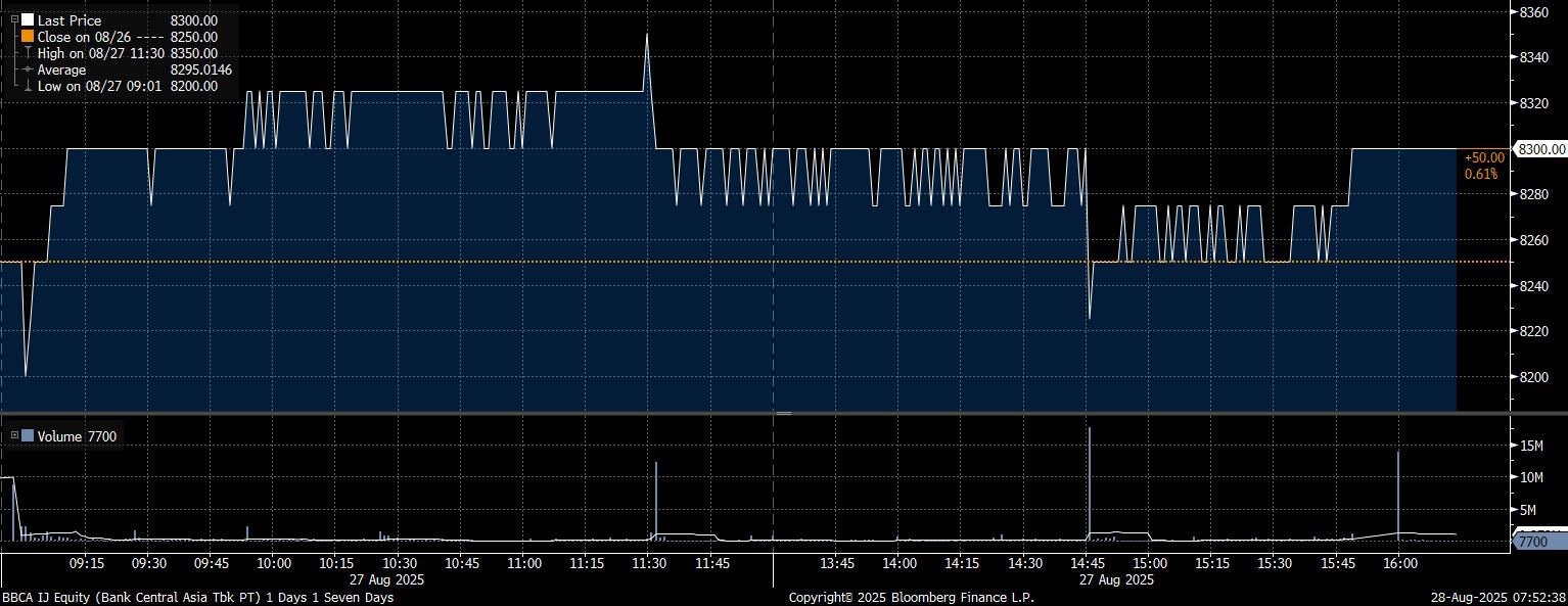 Bloomberg Technoz, Jakarta - Pada perdagangan saham kemarin, Rabu 27 Agustus 2025, Indeks Harga Saham Gabungan (IHSG) ditutup di zona hijau dengan penguatan 0,38% hingga terapresiasi positif di posisi 7.936,17.