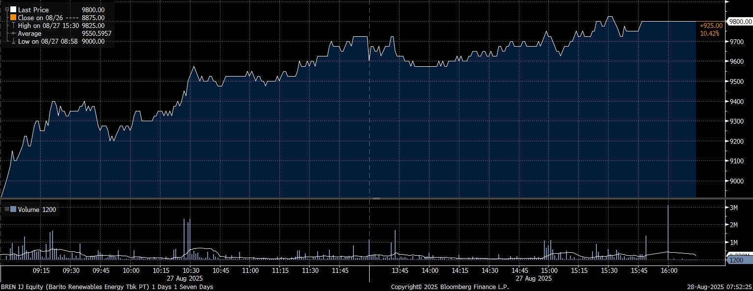 Sedang pada kesempatan yang sama, investor asing mencatatkan net buy terbanyak pada saham PT Barito Renewables Energy Tbk (BREN) mencapai Rp306,27 miliar. Tersengat dorongan pembelian yang besar, saham BREN melesat 10,42% dan ditutup di posisi Rp9.800/saham.
