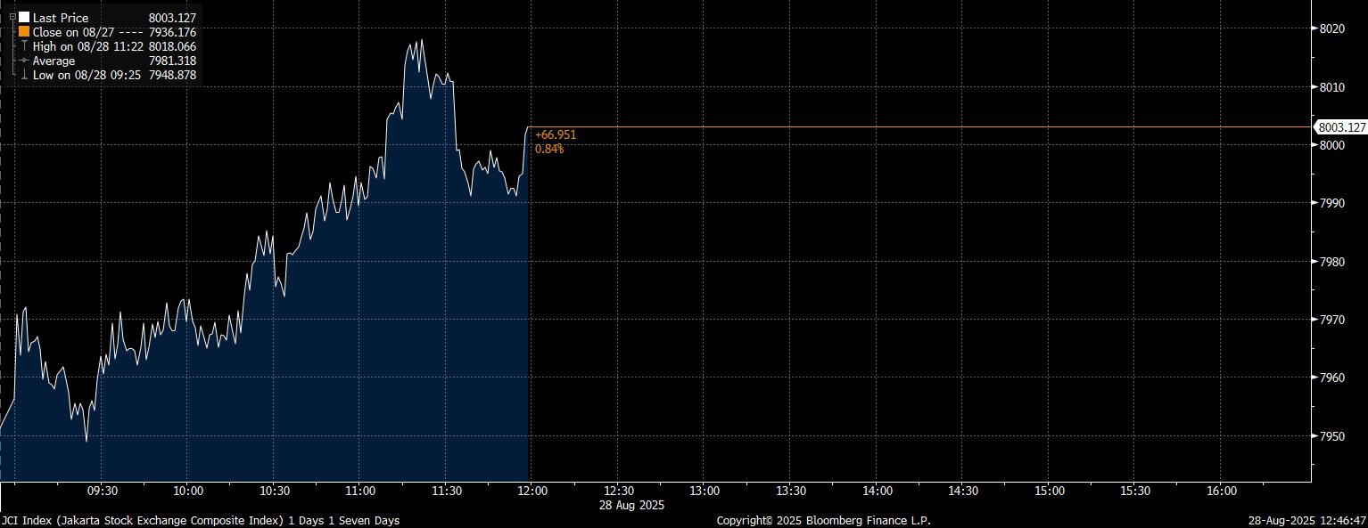 Bloomberg Technoz, Jakarta - Indeks Harga Saham Gabungan (IHSG) pada perdagangan Kamis (28/8/2025) kenaikannya amat optimistis hingga berhasil berada di atas level resistance 8.000. Hingga jeda Sesi I, IHSG mencatat kenaikan mencapai 0,84% di posisi 8.003,12.