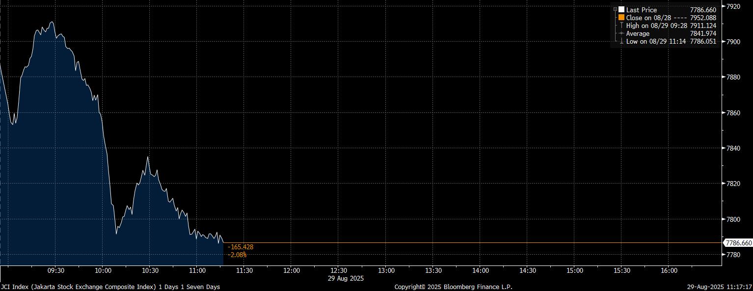 IHSG sudah jatuh sejak awal perdagangan pagi tadi. langsung ambles sesaat setelah pembukaan. IHSG dibuka melemah 0,66% ke level 7.899 pada perdagangan Jumat (29/8/2025) berdasarkan data Bloomberg.