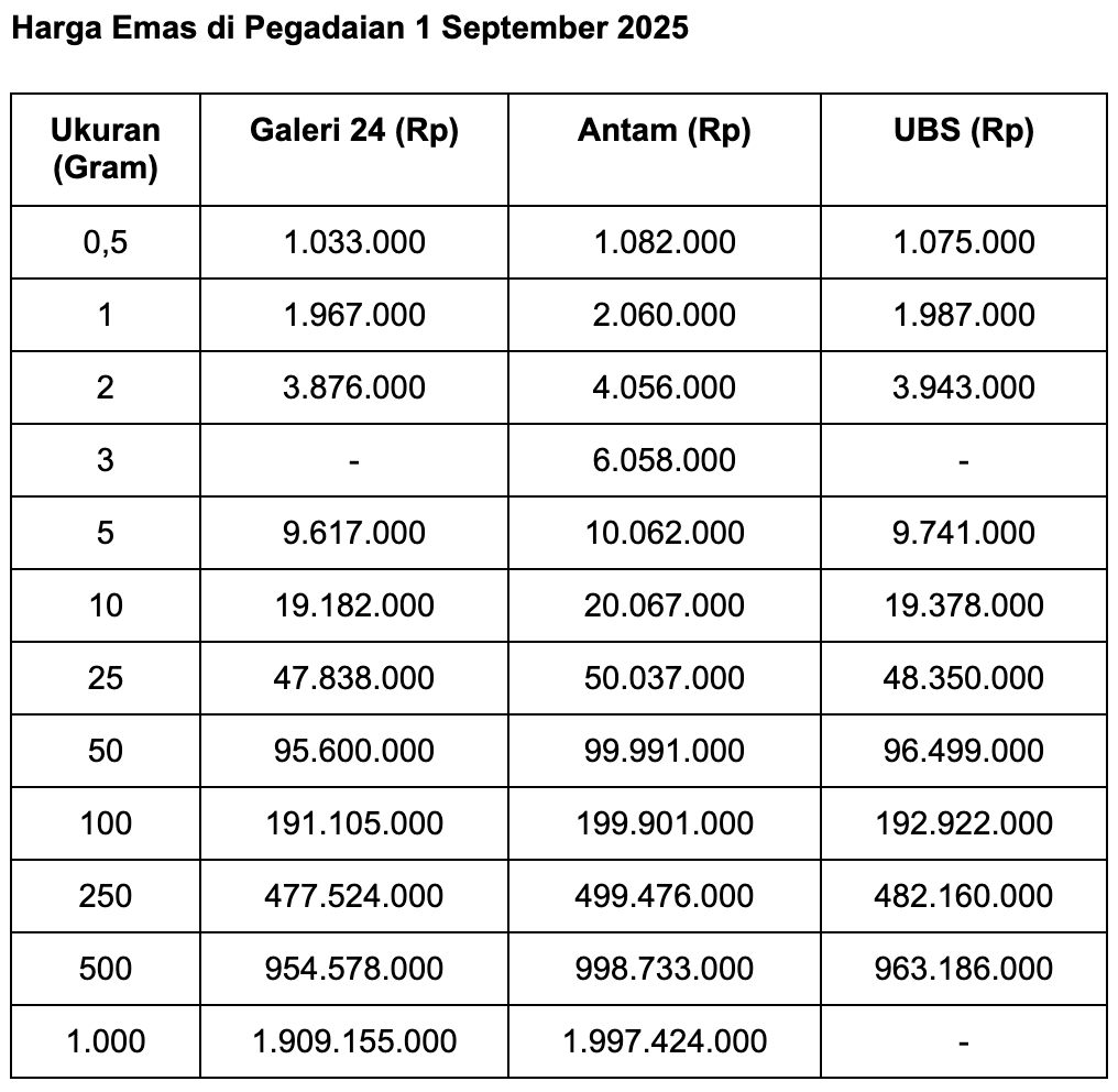 Daftar Lengkap Harga Emas di Pegadaian 1 September 2025