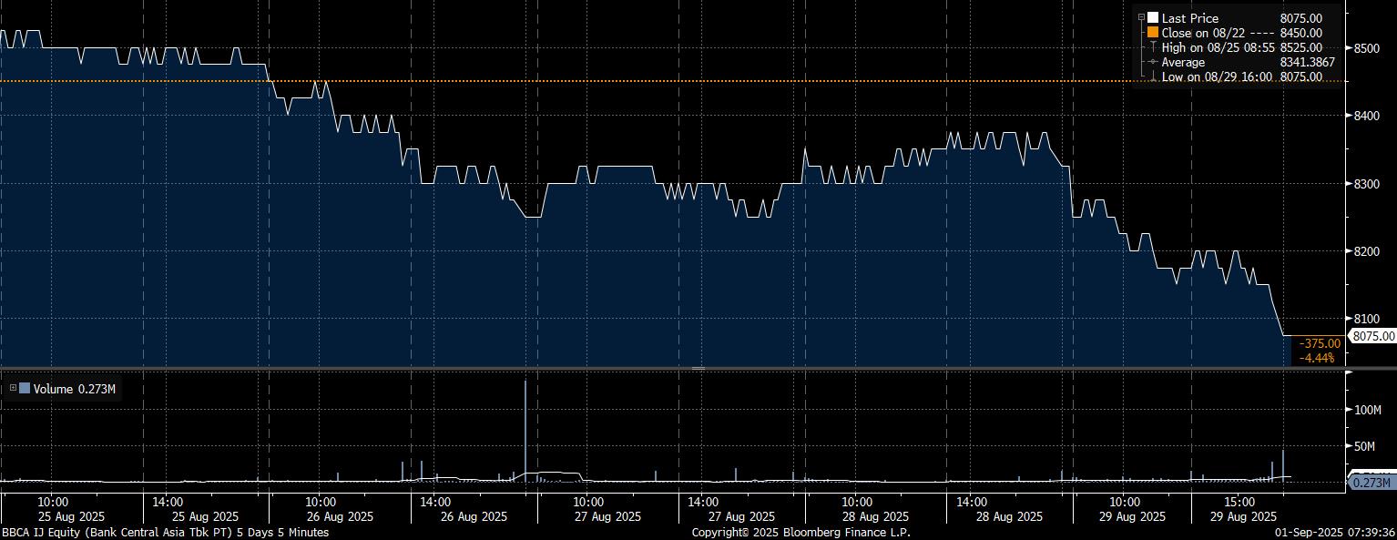 Pada kesempatan yang sama, investor asing mencatat net sell tertinggi pada saham PT Bank Central Asia Tbk (BBCA) mencapai Rp2,8 triliun. Imbas desakan jual investor asing, saham BBCA melemah 4,44% dalam sepekan di posisi Rp8.075/saham.