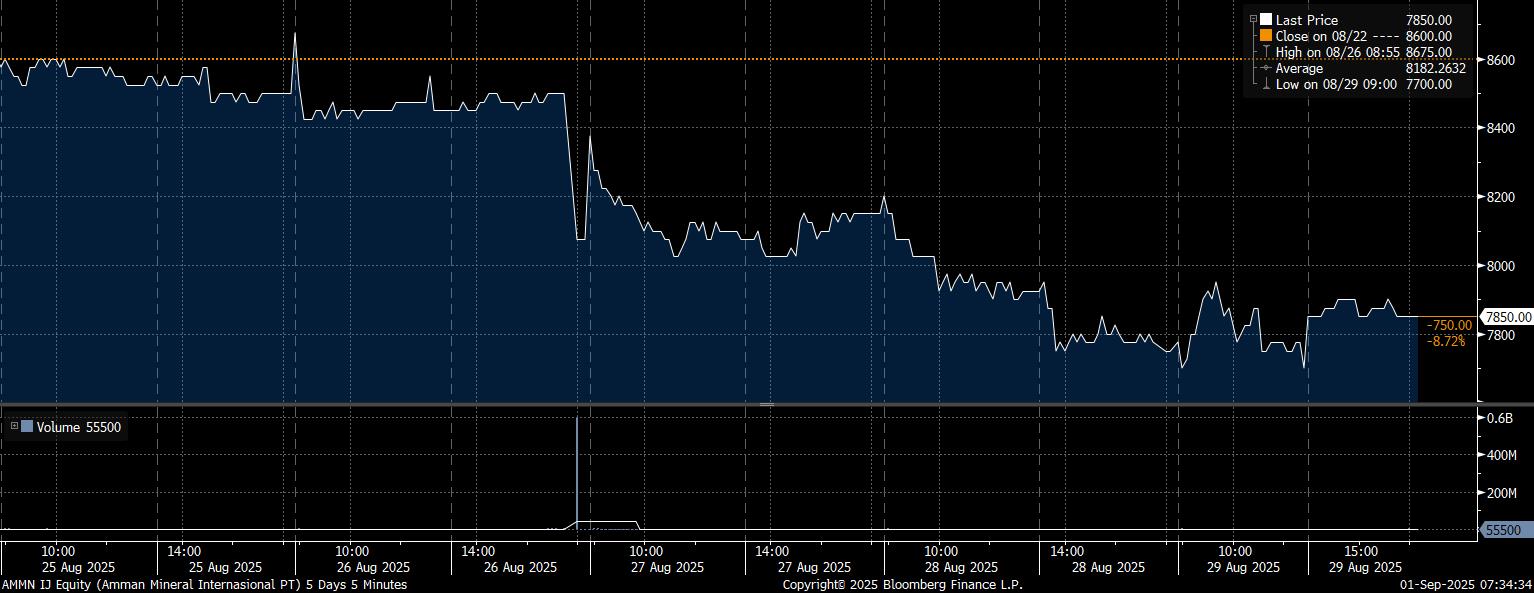 Adapun investor asing tercatat net buy saham terbanyak pada emiten PT Amman Mineral Internasional Tbk (AMMN) mencapai Rp2,31 triliun. Enggan sejalan dengan tren pembelian, saham AMMN melemah 8,72% dalam sepekan ke posisi Rp7.850/saham.