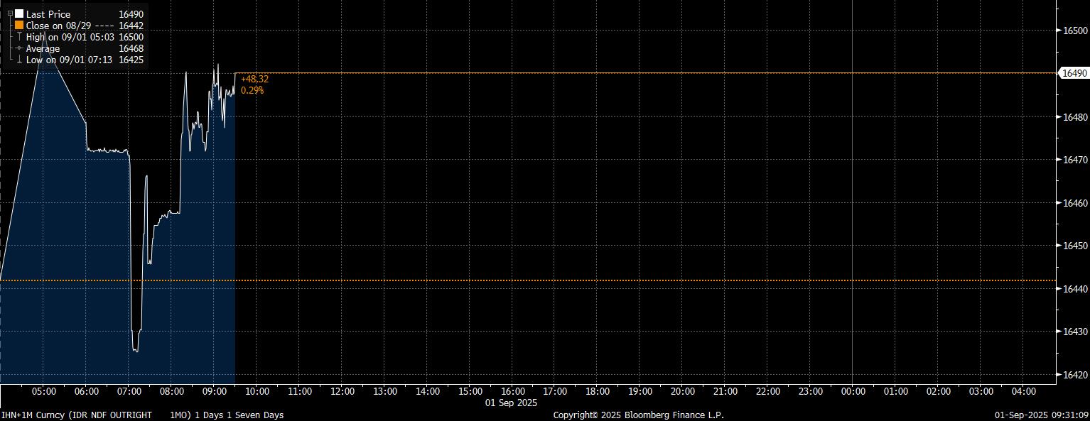 Melansir data Bloomberg pada pukul 9.30 WIB, rupiah di pasar offshore melemah ke level Rp16.490/US$. Level terlemah rupiah NDF offshore hari ini terjadi pagi tadi di Rp16.500/US$.