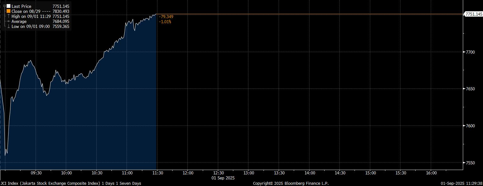 Bloomberg Technoz, Jakarta - Pelemahan IHSG menipis– biarpun masih ada di zona merah, melemah 79 poin (1,01%) di posisi 7.751,14 pada perdagangan Senin (1/9/2025). Adapun IHSG sempat ambles hingga 3% lebih pada pembukaan perdagangan pagi hari tadi.