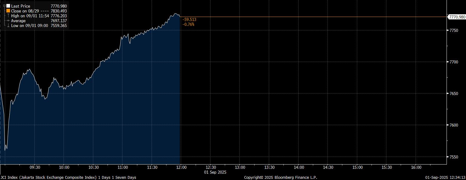 Pada Senin (1/9/2025), IHSG Sesi I ditutup di posisi 7.770,98 pada penutupan jeda perdagangan. Melemah 0,76% daripada hari sebelumnya. Posisi tersebut sedikit membaik, dibanding dengan level terendahnya yang sempat ambles 3% lebih pagi tadi.
