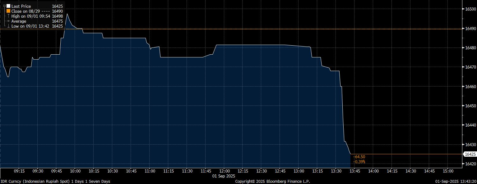 Bloomberg Technoz, Jakarta - Rupiah menguat tajam pada siang hari ini, Senin (1/9/2025) pasca rilis data inflasi Agustus yang menunjukkan deflasi 0,08% mtm di luar ekspektasi pasar, dan setelah data kinerja manufaktur Indonesia kembali ke zona ekspansif pada Agustus.