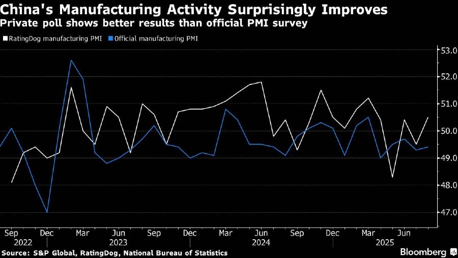 Hasil survei swasta cenderung lebih kuat daripada survei resmi, sebagian karena ekspor berjalan sangat baik. Survei manufaktur RatingDog mencakup 650 responden, sekitar seperlima dari jumlah yang dimasukkan dalam laporan bulanan Badan Statistik Nasional.