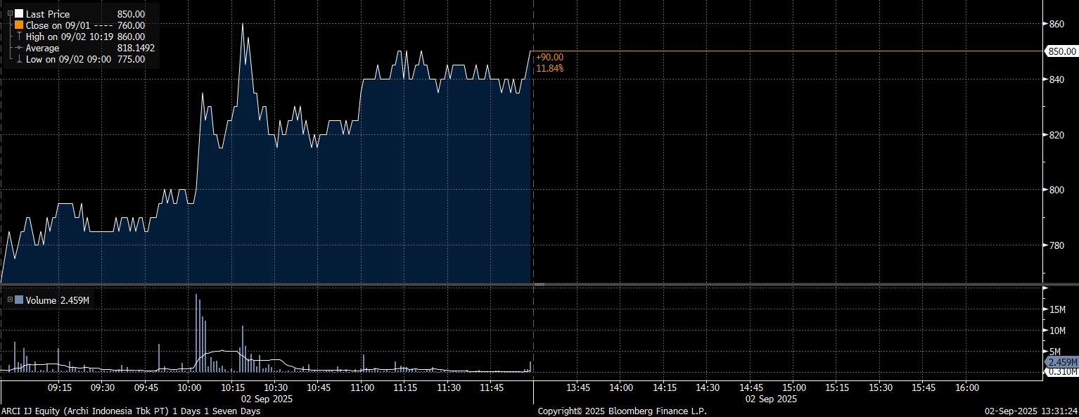 - PT Archi Indonesia Tbk (ARCI) menguat 11,84% ke posisi Rp850