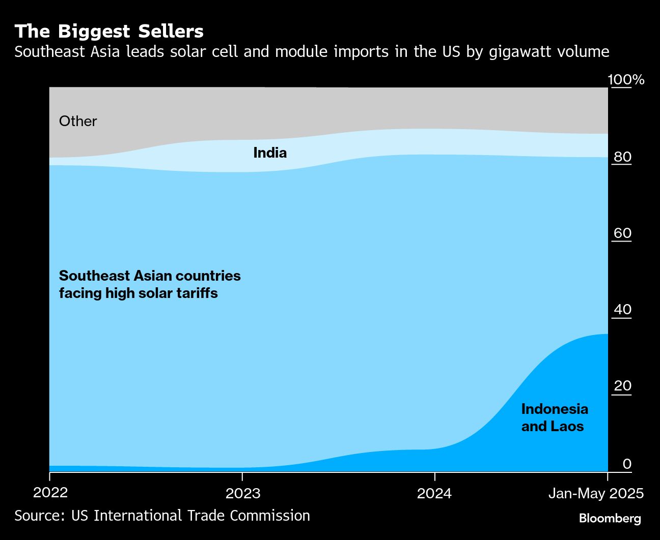 Secara total, enam perusahaan yang disebutkan menjual panel dan sel surya ke AS senilai US$419 juta pada paruh pertama 2025 — naik 148% dari tahun sebelumnya.