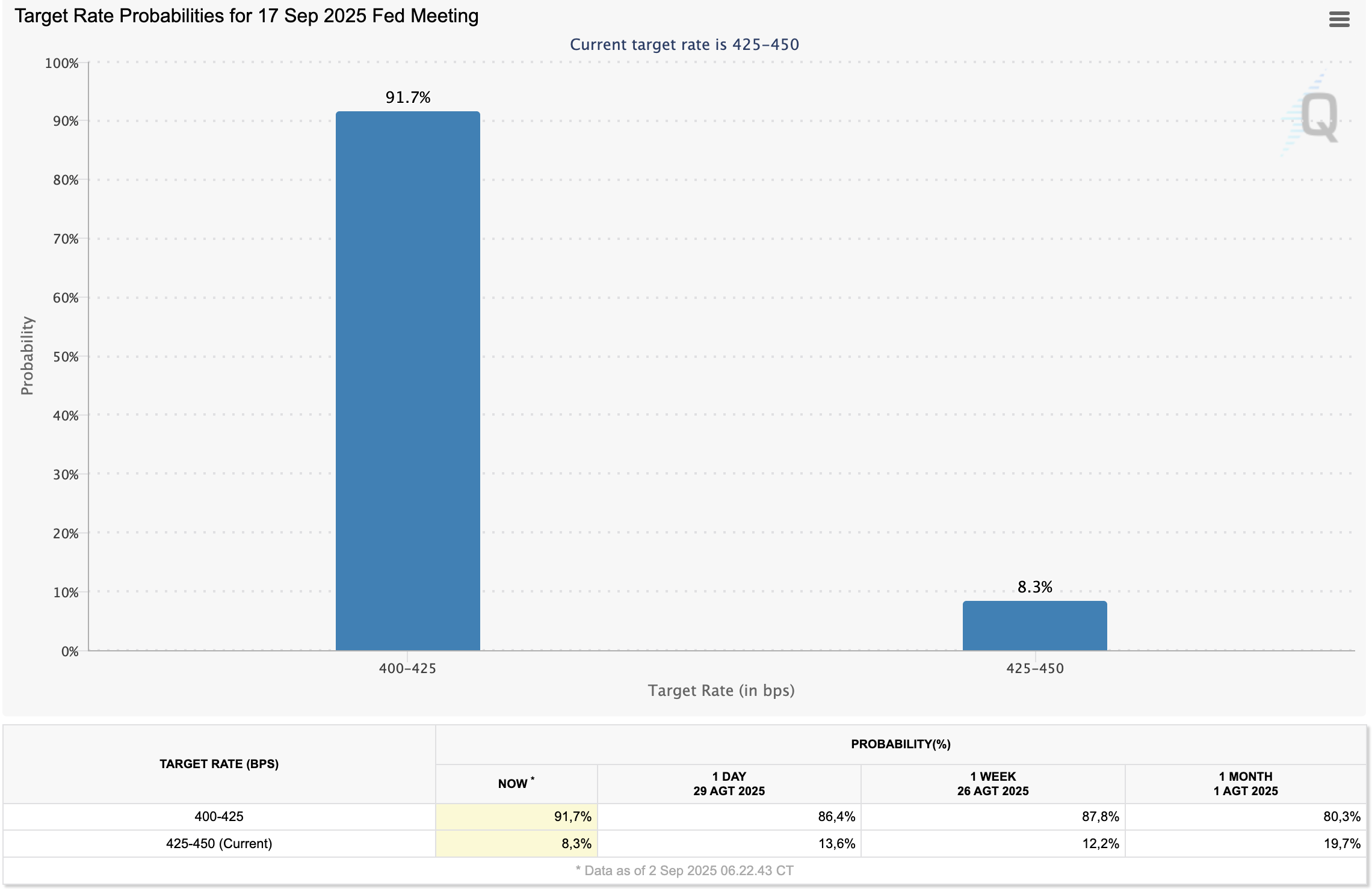Mengutip CME FedWatch, probabilitas penurunan Federal Funds Rate sebesar 25 basis poin (bps) menjadi 4-4,25% dalam rapat September adalah 91,7%. Seminggu yang lalu, kemungkinannya masih 87,8% dan sebulan lalu adalah 80,3%.