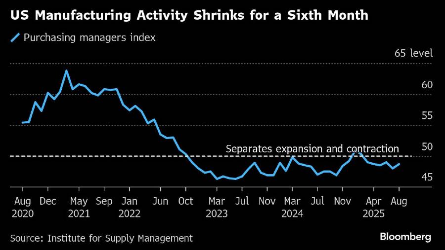 Bloomberg, Aktivitas pabrik di AS menyusut pada Agustus dalam enam bulan berturut-turut, didorong oleh penurunan produksi yang menunjukkan sektor manufaktur masih terhambat oleh tarif impor yang tinggi.