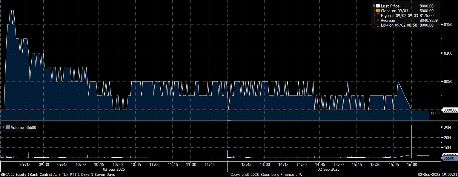 Adapun investor asing net sell besar pada saham PT Bank Central Asia Tbk (BBCA) mencapai Rp598,68 miliar. Imbas tekanan jual yang masif, saham BBCA melaju stagnan dan flat di posisi Rp8.000/saham.