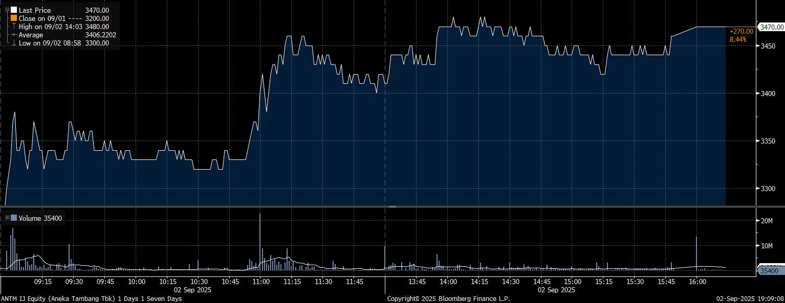 Sedang pada kesempatan yang sama, investor asing mencatatkan net buy terbanyak pada saham PT Aneka Tambang Tbk (ANTM) mencapai Rp463,53 miliar. Bersamaan dengan pembelian yang besar, saham ANTM menguat 8,44% dan ditutup di posisi Rp3.470/saham.