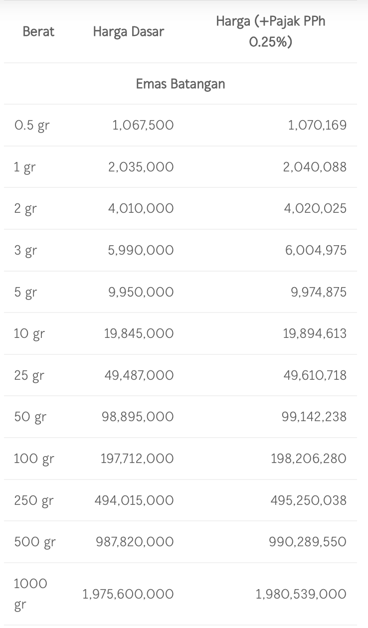 Berikut daftar harga emas Logam Mulia Antam selengkapnya untuk hari ini: