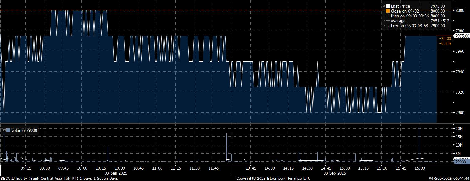 Adapun investor asing net sell besar pada saham PT Bank Central Asia Tbk (BBCA) mencapai Rp939,7 miliar. Imbas tekanan jual yang masif, saham BBCA melemah 0,31% di posisi Rp7.975/saham.