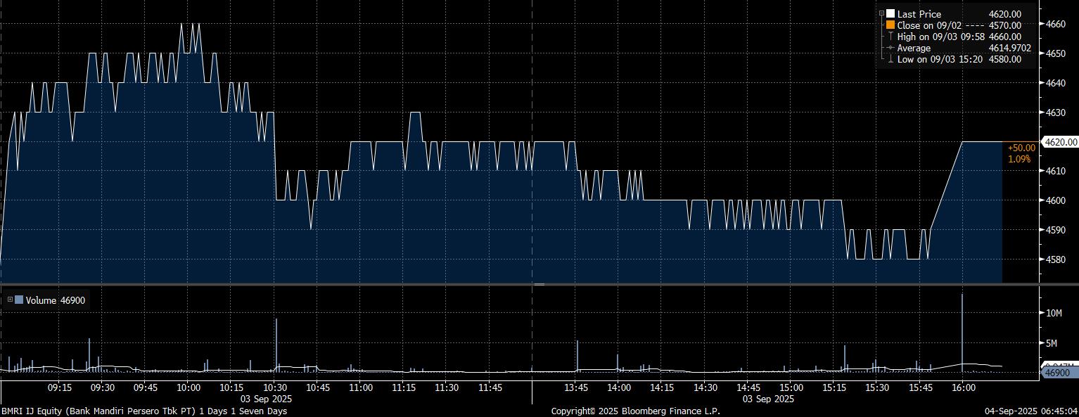Sedang pada kesempatan yang sama, investor asing mencatatkan net buy terbanyak pada saham PT Bank Mandiri Tbk (BMRI) mencapai Rp151,04 miliar. Bersamaan dengan pembelian investor, saham BMRI menguat 1,09% dan melesat di posisi Rp4.620/saham.