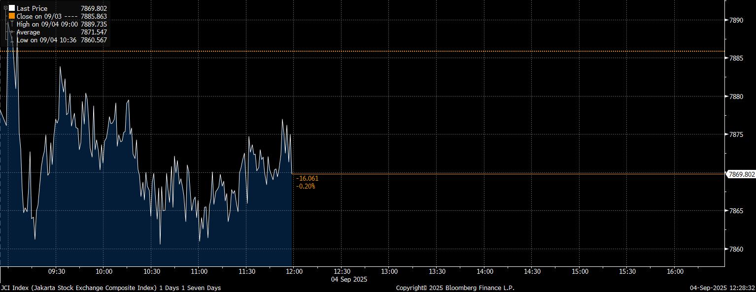 Bloomberg Technoz, Jakarta - Indeks Harga Saham Gabungan (IHSG) menutup perdagangan Sesi I di zona merah. IHSG melemah 16,06 poin atau kehilangan 0,2% ke level 7.869,8 pada Kamis (4/9/2025). Saham ARCI, PYFA, hingga saham Antam (ANTM) jadi pemberat.