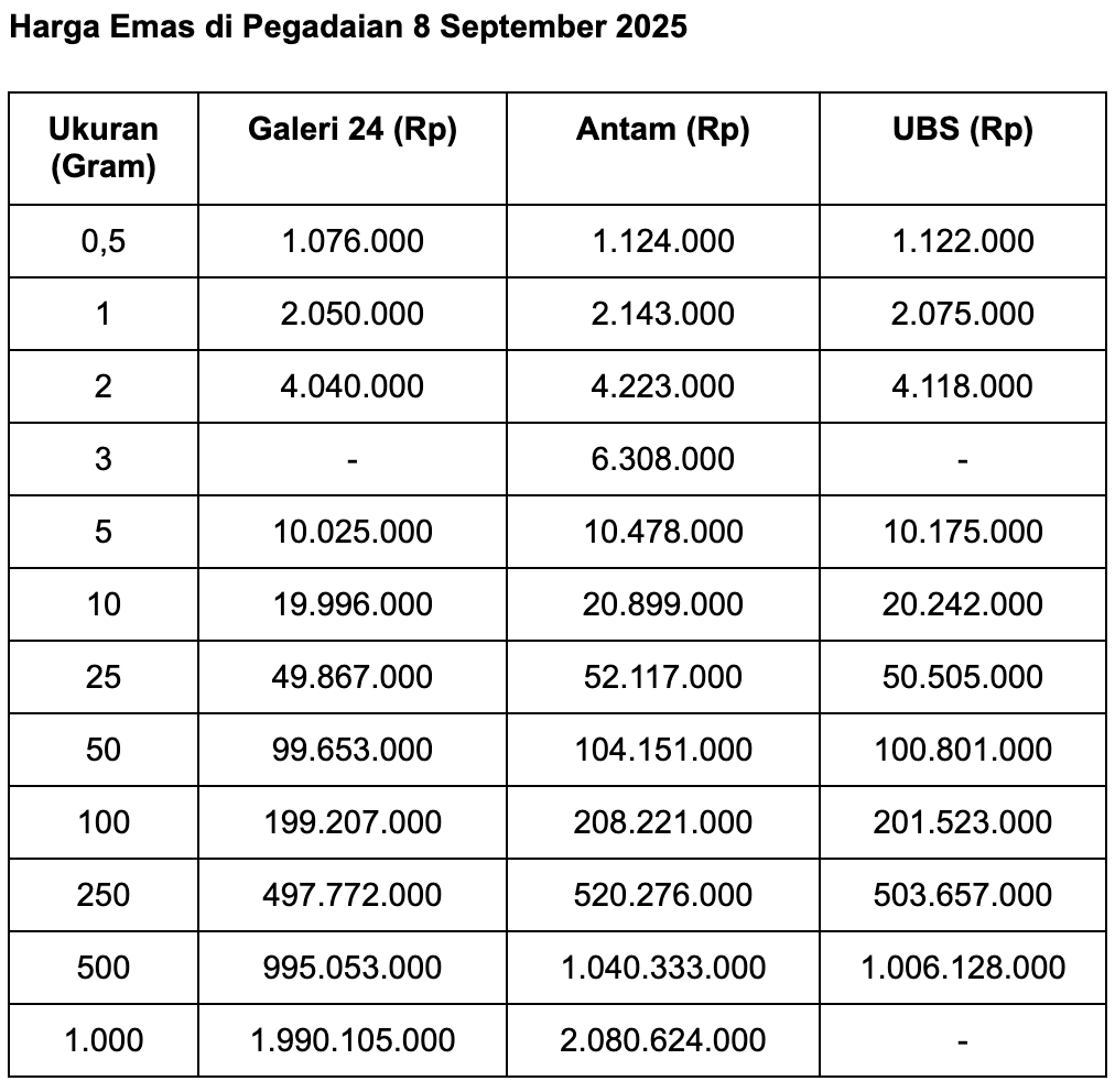 Pada Senin (8/9/2025), harga emas batangan cetakan PT Aneka Tambang (Persero) Tbk (ANTM) untuk ukuran terkecil 0,5 gram di Pegadaian adalah Rp 1.124.000. Sementara untuk ukuran 1 gram, harga emas Antam di Pegadaian adalah Rp 2.143.000.