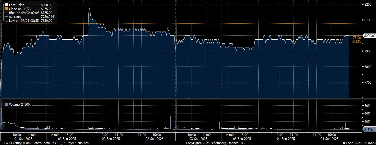 Adapun investor asing mencatat net sell tertinggi pada saham PT Bank Central Asia Tbk (BBCA) mencapai Rp3,17 triliun. Imbas tekanan jual investor asing, saham BBCA melemah 0,93% dalam sepekan di posisi Rp8.000/saham.