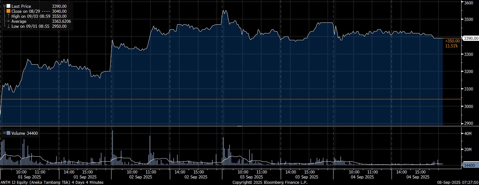 Pada kesempatan yang sama, investor asing tercatat net buy saham terbanyak pada emiten PT Aneka Tambang Tbk (ANTM) mencapai Rp757,89 miliar. Sejalan dengan tren pembelian yang masif, saham ANTM menguat 11,51% dalam sepekan ke posisi Rp3.390/saham.