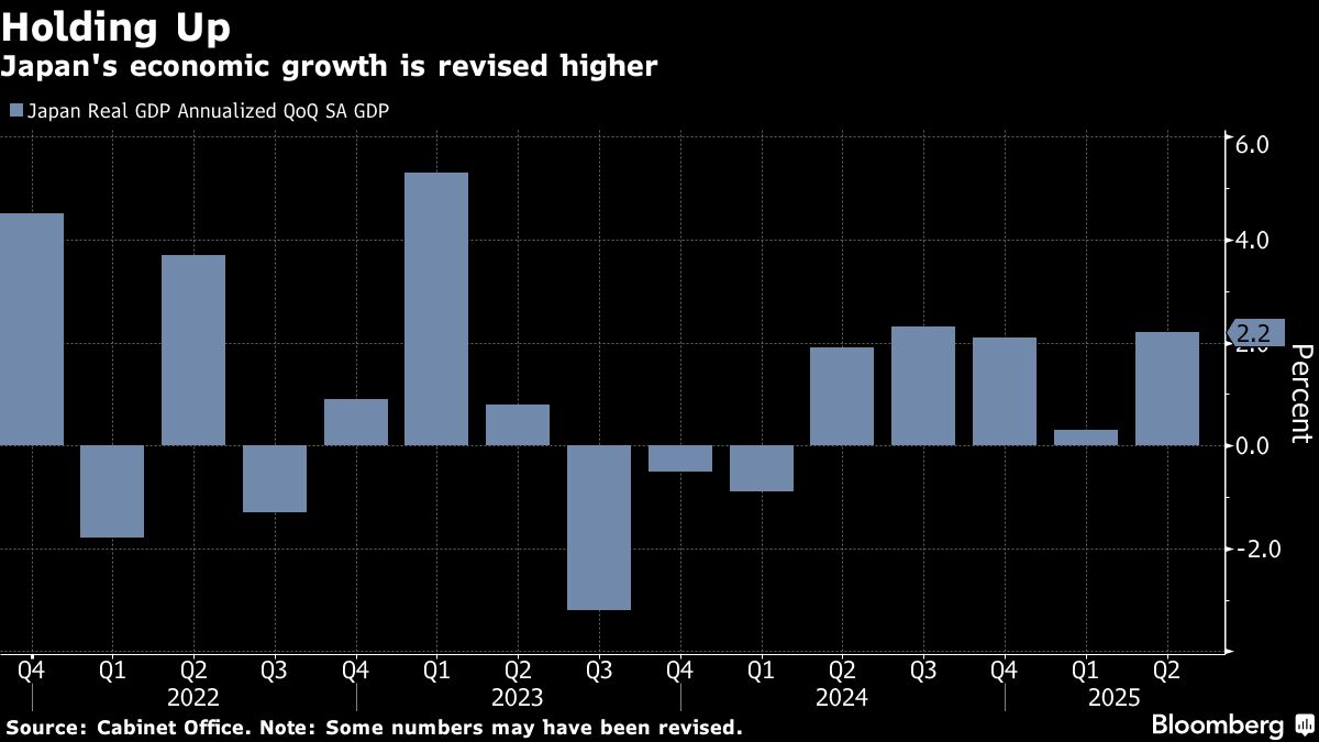 Produk domestik bruto (PDB) Jepang naik dengan laju tahunan 2,2% pada kuartal lalu, menurut Kantor Kabinet. Angka ini jauh di atas estimasi awal 1,0%. Sebelumnya, perkiraan median para analis memperkirakan tidak ada perubahan dari angka awal.