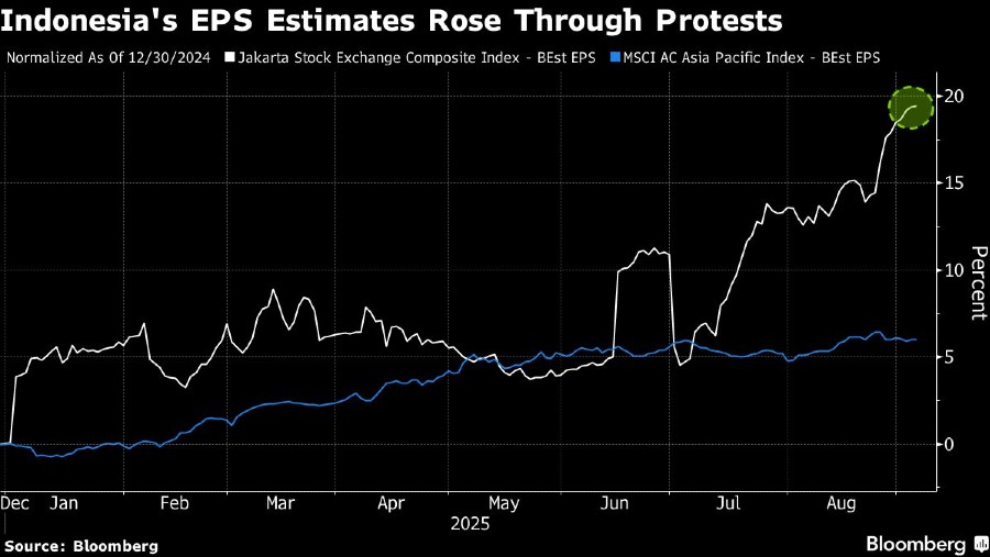 Perkiraan laba 12 bulan ke depan untuk perusahaan-perusahaan di Indeks Harga Saham Gabungan (IHSG) telah naik lebih dari 4% sejak protes di negara tersebut dimulai sekitar dua minggu lalu, menurut data yang dikumpulkan oleh Bloomberg.