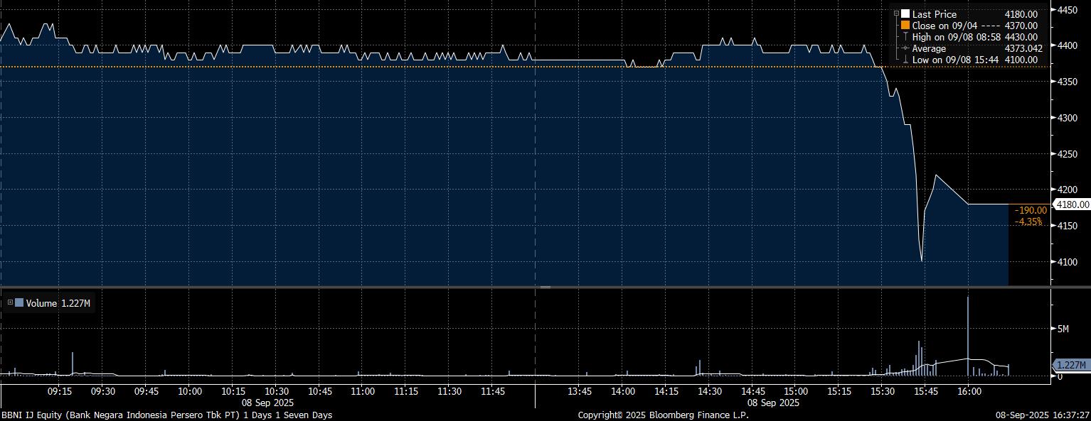 - PT Bank Negara Indonesia Tbk (BBNI) drop 4,34% ke level Rp4.180/saham